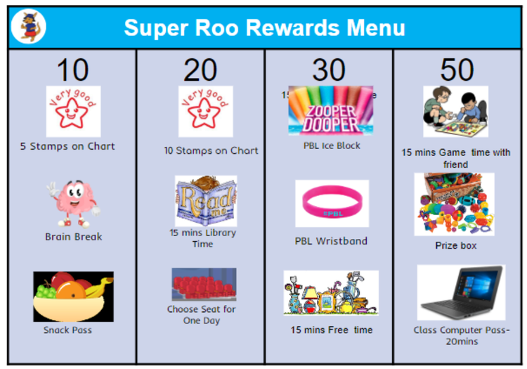 At the start of each year, each class develops a Token Menu, for students to save up their tokens and exchange them for a prize of their choice.